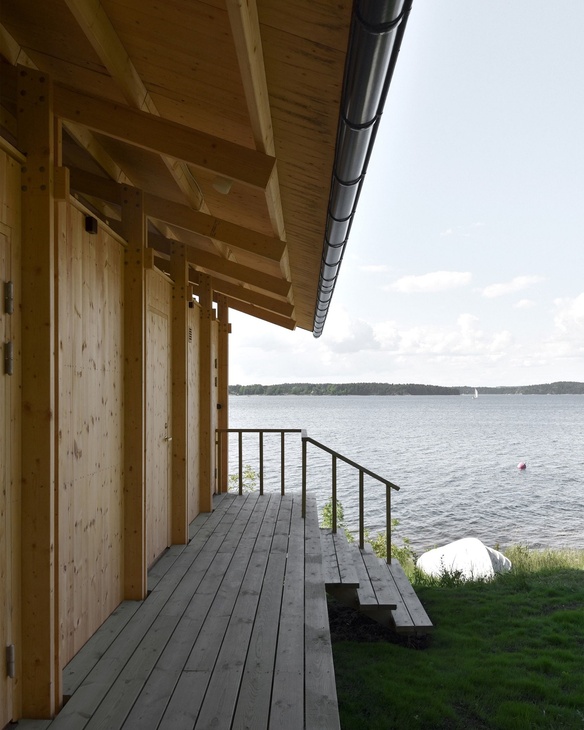 Co to tedy na pobřeží Smådalarö vyrostlo? Originální dřevostavba, která v sobě kombinuje několik funkčních programů. Je to objekt, sloužící k relaxaci a odpočinku. A to jak aktivnímu, protože majitel se rád realizuje kutilskou prací se dřevem, tak i hýčkavě uvolňujícímu. Uvnitř se totiž nachází i pro Švédy naprosto nezbytná sauna. Která, vzhledem k pozici na samém pobřeží, těží z výhledů na hladinu a ostrovy vpovzdálí. Těsný kontakt s hladinou tu ale ospravedlňuje jiný „motiv“. Stavba je současně úložištěm, chcete-li, garáží pro lodě a skladem materiálu.