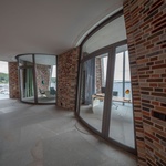 Převažujícím materiálem vnitřních a vnějších stěn budovy jsou klasické dánské cihly. Tvoří nejmenší možný stavební celek a sledují ryze organický tvar budovy. Z dálky se zdá být povrch uspořádaný, ale při bližším pohledu jsou viditelné různé tvary a nepravidelné odstupňování hloubky cihel. Zdivo zahrnuje podle slov autora návrhu patnáct různých odstínů neglazovaných cihel; další barvy glazovaných cihel jsou začleněny do vyřezávaných částí, aby vznikly barevné odlesky odrážející vodu a oblohu. „Cihly plní nejenom estetickou, ale i technickou funkci,“ vysvětluje na internetových stránkách svého studia a popisuje každý detail budovy i funkci po stěnách rozmístěných dutých větracích cihel, které modulují zvuk i teplotu. „Každý roh, výklenek a oblouk vyžadoval individuální řešení kladení cihel; každá cihla byla speciálně zapravena do složitého zakřivení betonových stěn, přičemž celkové zdivo leží v jedné rovině se zakřivenými ocelovými rámy a skleněnými prvky fasády,“ pokračuje ve svém výkladu a odkazuje na obrazovou část textu.