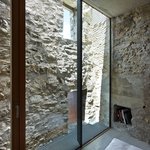 Prosklení bylo využito i v kuchyni, kde se tak otevřel nevšední výhled na blízké jezero, a také v obytných místnostech, kde byla ponechána holá stěna z kamene, která byla z estetických a funkčních důvodů překrytá skleněnou deskou. „Kamenné stěny se tím podařilo integrovat do interiéru přitažlivým a nenásilným způsobem, a přitom zůstal zachován historický kontext,“ říká Jérôme de Meuron. Dům je nyní moderní a světlý, a přitom neztratil nic z původních architektonicky cenných prvků, ať už kamenných stěn nebo sklepní klenby v přízemí. „Přitom prvky realizované rekonstrukce svými tvary a barevným laděním nesoupeří s „historickou esencí“ kamenného domu,“ dodává de Meuron. „Jsou tu přírodní impregnované betonové podlahy, tmavá šedivá omítka na stropech a obklady z modřínového dřeva. Není to kontrast, je to příklad souladu.“