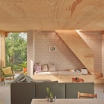 Interiér je při své otevřenosti přehledný a také kompaktní. Kuchyňský blok je zabudován do boxu vytvořeném z betonových cihel (a ty zase vytváří oporu pro schodiště vedoucí do patra). Betonové cihly sice rámují celý obytný prostor, ale jinak exteriéru i interiéru vévodí dřevo a jeho medově hřejivé tóny. Nejvíc pozornosti si pochopitelně zaslouží střecha. Dřevěná, sedlová, šikmá. A průhledná tak, že v prvním patře vytváří podél celého profilu jakýsi střešní skleník. Obsahuje velký a světlý prostor, který může fungovat jako ateliér, obývací pokoj anebo prostě jen univerzální obytný prostor. Je v podstatě nezabydlený, snad až na pracovní stolek a křeslo.