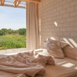 Jinak, v duchu lehkosti a harmonie s okolním prostředím, se místnosti domu opírají o širokou krytou terasu na západě, která je zpřístupňuje vnějšímu prostředí. V ložnicích jsou postele umístěny vlastně přímo podél fasády, takže jsou přístupné jak zevnitř, tak přímo z terasy. A v duchu odbourávání hranic mezi vnitřním/vnějším hraje i sprcha, přístupná přímo zvenčí.