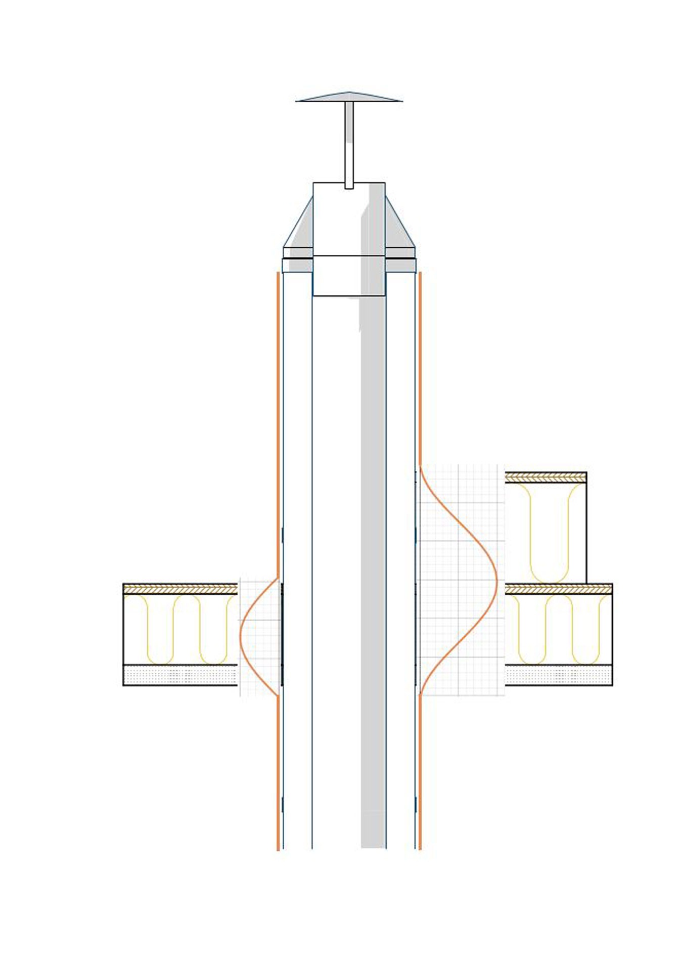 Pokud se jedná o systémový komín, měla by být (neříkám, že vždy je) situace relativně jednoduchá, neboť povinnost určit bezpečnou vzdálenost od hořlavých materiálů ukládají výrobcům komínových systémů harmonizované technické normy. Bezpečná vzdálenost v milimetrech (tzv. požární bezpečnost zevniř ven) je dnes deklarována zpravidla již několika hodnotami podle toho, jakým způsobem je komínové těleso zabudováno ve stavbě a jaké jsou parametry průchodu komína konstrukcí. Zodpovědný výrobce k tomu na základě termických zkoušek publikuje potřebné podklady formou detailů, schémat, montážních návodů, technických listů apod, a tím umožní srozumitelnou interpretaci požadavků potřebné vzdálenosti pro konkrétní případ. Příklad možné formy deklarace bezpečné vzdálenosti na obrázcích 4 a 5.