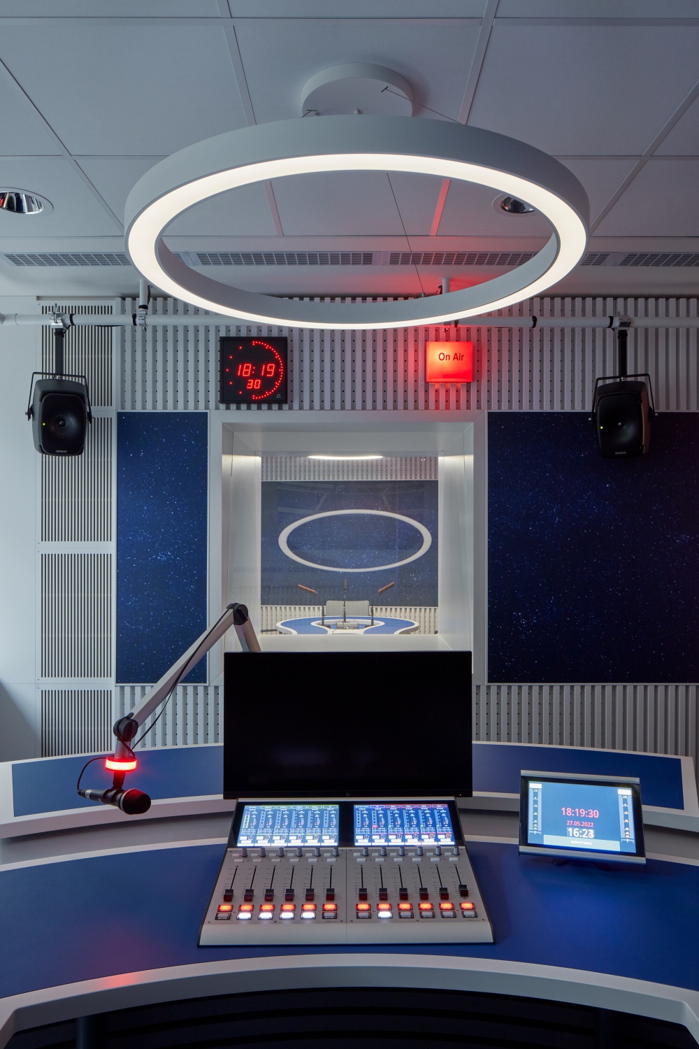 Tvar a proporce vysílacích studií, režie a samoobslužných studií vzešel z možnosti vestaveb do stávající skeletové konstrukce. Design a materialita studií jsou podřízeny potřebám prostorové akustiky. Jako v celém objektu i zde převládá bílá barva s pásem modré noční oblohy – éteru, kterým se šíří radiové vlny.