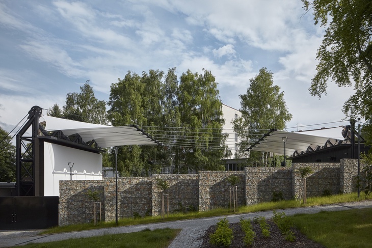K létu patří krásné hvězdné nebe, a to nespatříte na stropě obýváku, ale venku, nejlépe mimo město, bez světelného smogu. Nebo na terase, na balkóně, při pohledu z okna, ale také v letním kině. Nezapomenutelný zážitek bylo před léty vidět na letní kině Vetřelce, kdy posádka sedí za obrovským oknem, hledí do kosmu a poslouchá, s nostalgií a smutkem po domově, Mozarta. Vy sedíte pod hvězdným nebem letního kina, a to spojení reality s fikcí je takřka dokonalé. Posléze jste však rádi, že to spojení naštěstí není reálné, to ve chvíli, kdy vetřelec začne likvidovat posádku. Stačí, že se pak za tmy vracíte domů a za každým stromem může číhat slintající vetřelec… Ale i to je součást dobrého prožitku a vy víte, že vám alespoň funguje představivost a taky paměť. Taky milé zjištění. Mimo toho, že jsou jistá kritéria, daná normami pro typologii kin a divadel, je letní kino méně svázané normami a uzancemi. Zažil jsem letní kino na lavicích, na úplné rovině sklizeného pole kdesi na Vysočině, kam přijela V3Ska, spustila boční stěnu a pan Ponrepo spustil biják. Stejně tak si můžete položit deku na svahu zahrady historické secesní Vily Löw-Beer a kino Art může začít s produkcí. Takových příkladů, které nejsou zcela standardní, zato však skvělé, nalezneme nepočítaně. Jednou jsem se jako kluk díval přes ohradu letního kina v bývalé Jugoslávii ze střechy autobusu Škoda 706 RTO, kterým jsme přijeli k moři a šofér byl „strejda všech dětí“ a vymyslel českou variantu „zadara“. Taková nějaká šílená honička na člunech v Benátkách, pod chorvatským nebem se řvoucími cikádami a vůní moře s borovicemi. Skvělé, moc skvělé. Stejně tak existují rozličné přírodní amfiteátry. Krásným příkladem je vlna zastřešení budov vinařství Lahofer u Znojma, jež tvoří nádherné stupně hlediště. Takže, jak může vypadat letní kino není až tak striktní záležitost, ale shodneme se, že pokud je to stavba na delší dobu, pak ať to nějak vypadá. Přesně tak si stojí i tento projekt, který rekonstruoval staré letní kino, změnil se z chátrajícího na krásně nový a funkční areál s vlastní infrastrukturou, s menším počtem sedících než v původním letním kině. Gabionové stěny a přírodní kamenná dlažba jsou skvělým řešením, které doplňuje zázemí a promítací plocha s pódiem. A pochopitelně hlediště se sedačkami. Nad tím vším jsou na přistínění vypnuté odlehčené textilní plachtičky (membrány) na ocelových táhlech. Konkrétně nad částí hlediště a jevištěm na přistínění. Černá, šedá, beton a kámen působí sourodým naturálním dojmem. Vše je lehké, pragmatické a esteticky zdařilé. Zde si můžete nechat zdát svůj filmový sen pod širým nebem nebo absolvovat nějaké zajímavé vystoupení.