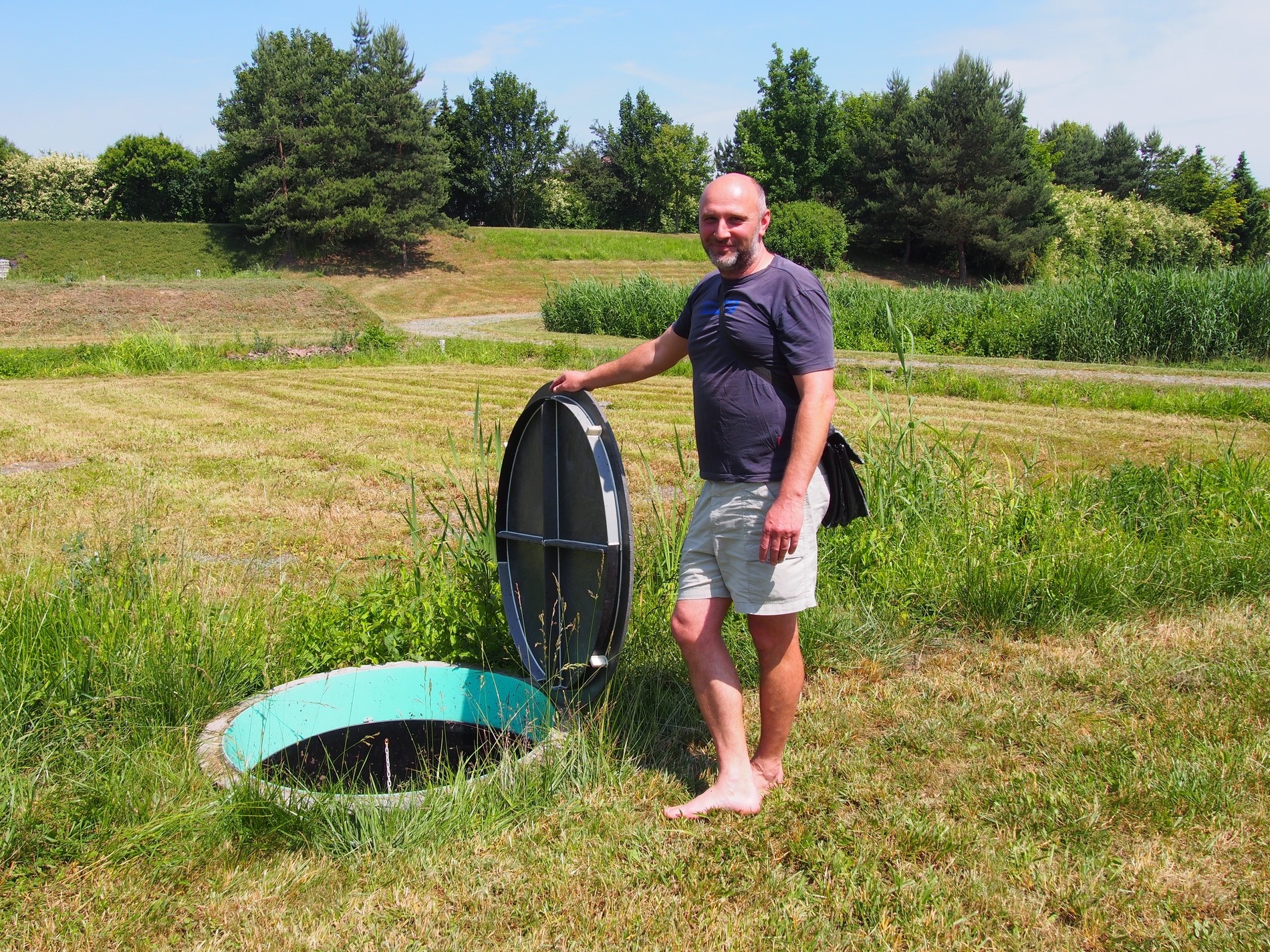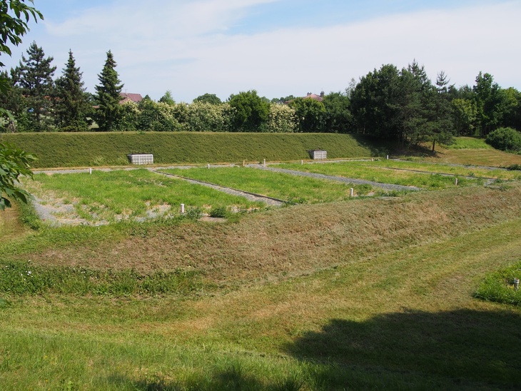 Co po příchodu vidíme? Především toho moc nevidíme, jen zeleň v několika polích, někde vzrostlá, někde posečená, mezi ní se vine obslužná štěrkem zpevněná cesta. Že se jedná o technické zařízení prozrazuje jen několik málo šachet vystupujících nad povrch.