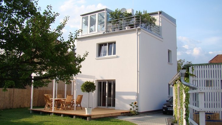 Jak je patrno z fotografií, dům má ploché betonové střechy, což je typické pro funkcionalistické stavby. Jako původní střešní krytina byly použity pouze asfaltové pásy, avšak bez jakékoliv tepelné izolace. Co se chybějící tepelné izolace střechy týká, mimo problému s únikem tepla v zimních měsících bývá také problém přehřívání místností nacházejících se přímo pod střechou v parném létě. Ještě před realizací ústředního vytápění bylo tedy nutno nejprve přistoupit k celkové rekonstrukci střešní krytiny, resp. k vybudování zcela nové střechy včetně odpovídajícího zateplení.