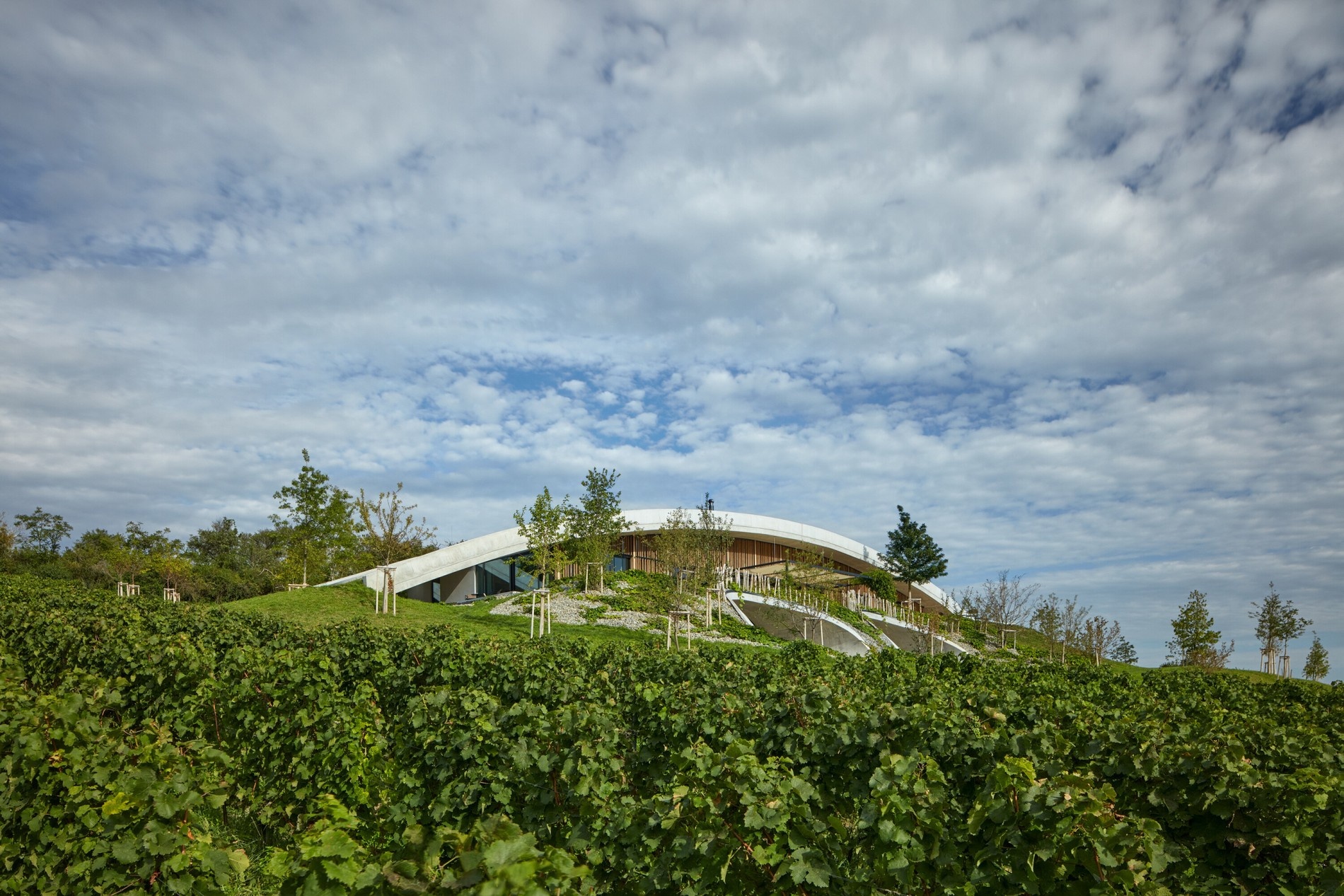 Vlna v krajině, pahorek mezi pahorky. Organická stavba vinařství reaguje na okolí