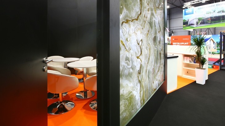 Na výstavě For Arch byla představena další unikátní novinka – podsvětlený digitální potisk v dekoru Onyx dopracovaný umělou inteligencí, který dokáže navázat jak v horizontální, tak i vertikální linii bez rozměrových omezení. Další výhodou tisku na sklo je opakovatelnost. „Pokud dojde k poničení skleněné tabule, dokážeme dekor kdykoliv nahradit a zajistit stejný odstín, čímž eliminujeme riziko odchylek v tonalitě. Naše skleněné tabule jsou tenčí než přírodní kámen, což usnadňuje jejich manipulaci. Navíc je sklo snadno udržovatelný materiál, který může být na přání klienta prosvícen jakýmkoliv motivem,“ doplňuje Andrea Stejskalová.