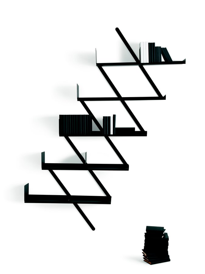 Booxx (design Denis Santachiara, Desalto), knihovnu lze na zeď zavěsit v jakékoliv pozici, rám z ocelového plechu, police s odnímatelnými zarážkami. © Design & Home