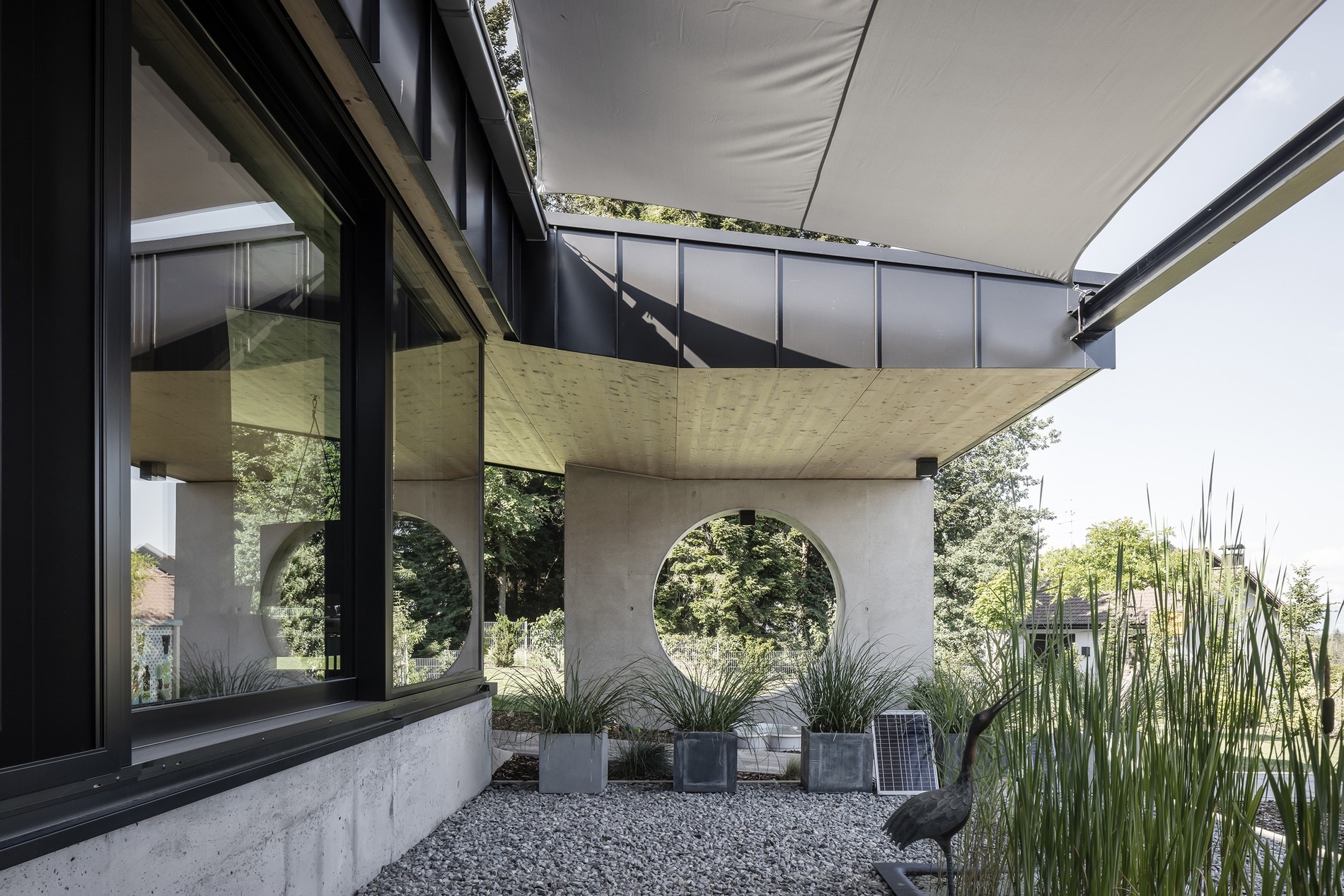 Na litém betonu obvodových zdí je usazena skutečně masivní střecha s konstrukcí z křížově vrstveného lepeného CLT dřeva. Proti chladu a tepelným ztrátám brání se jednak silnými zdmi, tak „udržitelnou“ izolací. Místo donedávna ještě obvyklého polystyrenu tu najdeme betonové desky obohacené o pěnové sklo. Poskytují tentýž termálně izolační efekt, ovšem bez přidružených ekologických neduhů.