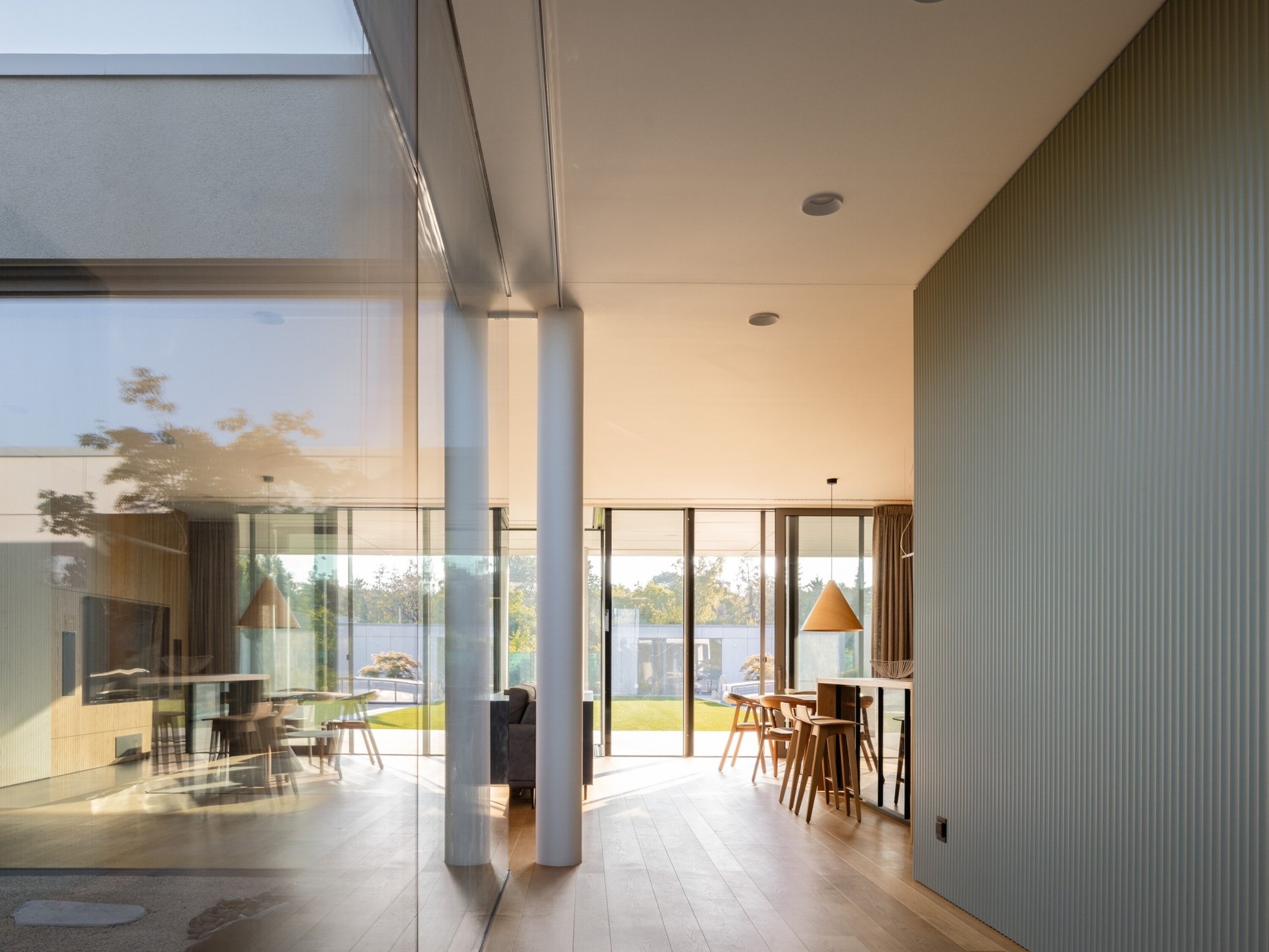 Do otvorenej dennej zóny domu prechádzame popri hosťovskom krídle s vlastným zázemím. Solídna materialita technického bloku, s kanelurovaným dreveným obkladom po pravej ruke, pôsobí ako protiklad k otvorenému átriu. Obojstranne presvetlená denná zóna s rozsiahlym presklením smerujúcim na juhozápad – do záhrady, aj do protiľahlého átria, zahŕňa obývaciu izbu, jedáleň a kuchyňu. Posuvné krídla zasklenia stierajú hranicu medzi interiérom a exteriérom. Bývanie sa v letných mesiacoch z veľkej časti presúva do tieneného priestoru terasy.