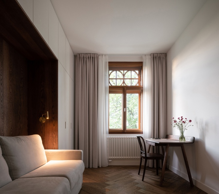 Protože vila Bianca není jen tak nějaká vila z počátku 20. století, i když prošla později radikální přestavbou a mnoha úpravami. Úkol, který zde řešil autorský kolektiv, není běžný. Jste architekt s velkou mírou zodpovědnosti za dílo, které vytvoříte nebo ještě „lépe“, kterým navážete na svého slavného předchůdce. Jak vše uchopíte? Z původního interiéru se nezachovalo takřka nic a je na vás, co s tím uděláte. Spojit nově vytvořený koncept s původním domem je vlastně hledáním vyjádření tohoto řešení v „rozhovoru“ koncepcí 112 let vzdálených. Autorský kolektiv viděl řešení v pravdivosti řešení a hledání formy, která vychází z účelu. Tuším, že jiné východisko zde neexistuje, pokud nechce autor jít cestou historické repliky (pro kterou nemá dostatek podkladů) nebo zcela markantního skoku v čase, do nějakého současného moderního minimalistického řešení. Moc víc možností se nám zde asi nenabízí. Tedy pokud nehodláme zcela zdivočet a vnést do věci něco nesourodého, neslučitelného, extravagantního a zcela odlišného. Řešení, které se odkazuje na dobu Jana Kotěry svým materiálovým pojetím mobiliáře a provedením konstrukcí, je jistým svorníkem mezi tehdejším interiérem (který de facto již neexistoval) a současným interiérem novým. Ten rébus je nesnadný, nicméně skvěle vyřešený.