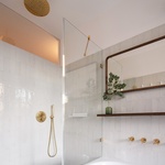 bílý lak – dveře, atypický nábytek mramor – podlahy v koupelnách obklad Ragno Gleeze – obklady v koupelných Lapitec – pracovní deska kuchyně a desky pod umyvadly přírodní mosaz – atypický nábytek těšínský pískovec – původní parapety |