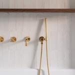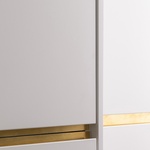 K době vzniku domu se přímo odkazujeme pouze volbou materiálů a výběrem solitérního nábytku. Tmavě olejovaný dub na parketových podlahách i nábytku a akcenty z přírodní mosazi budou s časem získávat přirozenou patinu. Sádrové stěrky na stěnách mají matný bílý nátěr jednotný s lakem dveří a lakem vestavěného nábytku. Necháváme tím vyniknout hru světla a stínu. V koupelnách kombinujeme nepravidelně tvarované obklady s jemnou kresbou mramoru na podlaze. Vášeň investorů pro sklo se odráží v množství zrcadel, skleněných svítidlech i dlouhém parapetu v obývacím pokoji navrženém jako sokl pro výstavu skleněných objektů.