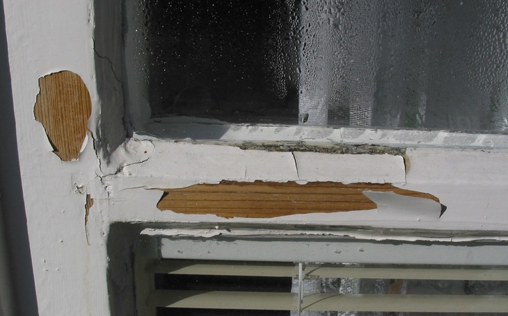 Obr. 2 Odlupování nátěrů oken – spodní část. Zdroj: Ing. Richard Milič, CSc.