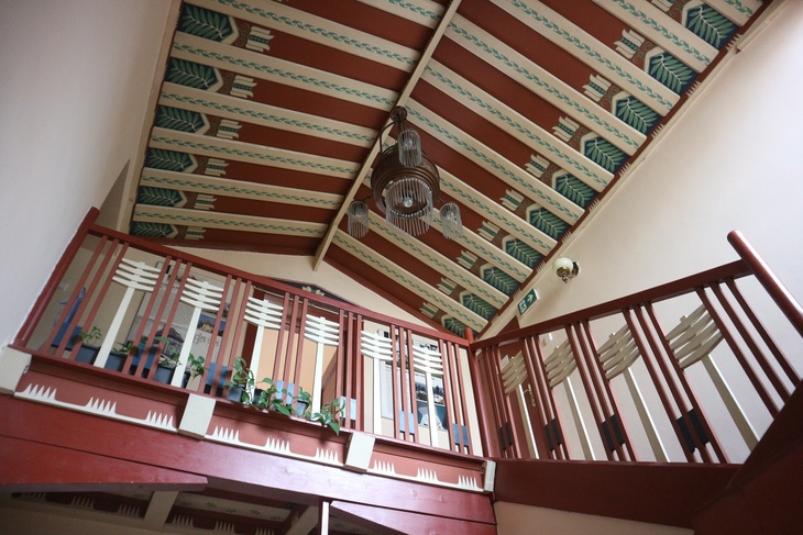 Inspirace anglickou architekturou je vidět i uvnitř domu. Ve spodním patře jsou umístěny reprezentativní místnosti, soukromá část s ložnicemi byla v patře. Tyto dvě části propojuje dvoupatrová schodišťová hala s galerií a nádherně malovaným stropem. I samotné schodiště je dekorativně pojato, na zábradlí se objevují geometrické a florální ornamenty v pestrých barvách. Vzhledem k velikosti domu ani hala není moc velká, to jí však rozhodně neubírá na honosnosti. Ozdobou je i zavěšený lustr navržený Kotěrou, zapůjčený z Umělecko-průmyslového muzea.