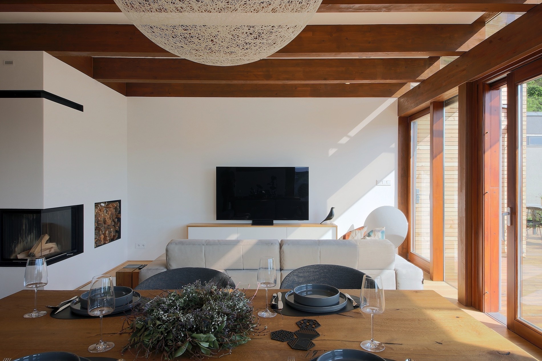 | Podlahy: | obytné místnosti – dubové lepené lamely; koupelny, předsíň a technické místnosti velkoformátová keramická dlažba; terasa z prken ze sibiřského modřínu |
