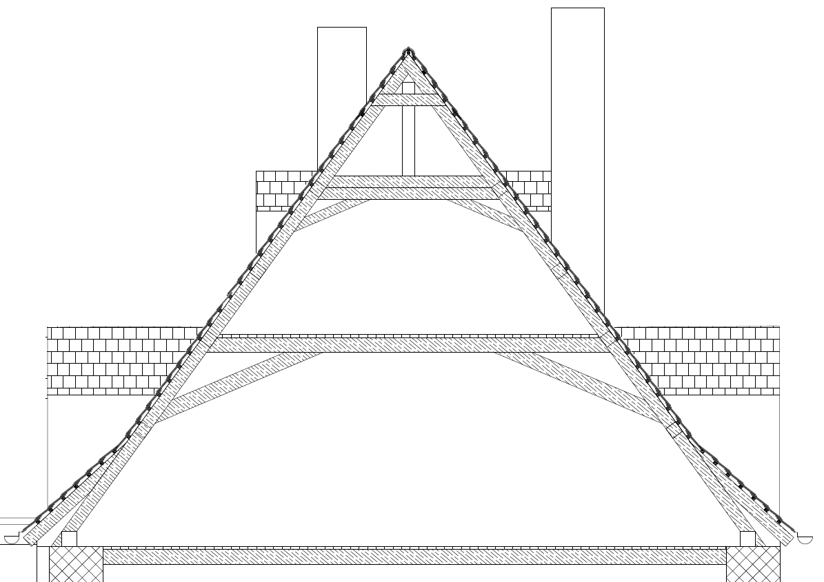 Příčný řez krovem z pracovní verze zaměření objektu, konstrukce krokevního krovu s dvěma patry hambalků a podélným vázáním ležatými stolicemi (vrcholová stojatá stolice je do konstrukce druhotně vložená) – průřezy prvků neodpovídají skutečnosti, horní pětiboká lyžina je nesprávně zakreslena čtvercovým průřezem a v nesprávné poloze, ležaté sloupky nejsou zakresleny vůbec, v dolním patře chybí i příčná rozpěra sloupků, spodní okapní vaznice je v nesprávné poloze, spoje nejsou naznačeny vůbec. Autor: Soňa Křivánková