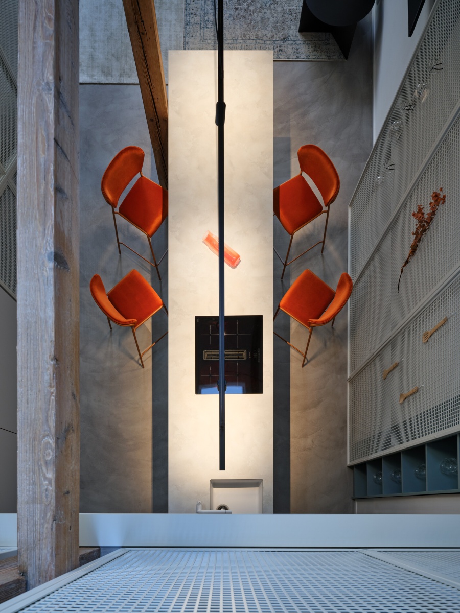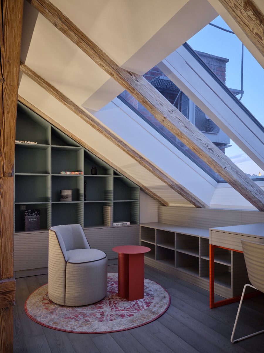 Velkou výzvou pro nás byla členitost starého půdního prostoru. Snažili jsme se s ním vypořádat citlivým zakomponováním jednotlivých prvků interiéru, které jsme navrhli a nechali vyrobit, jak je u nás zvykem, většinou na míru. Výsledkem je harmonický kontrast mezi moderními vloženými prvky a starým příběhem vyprávěným trámy původního krovu. Tento dialog mezi historickým a moderním dodává prostoru jedinečný charakter a vytváří poutavé prostředí pro jeho obyvatele.