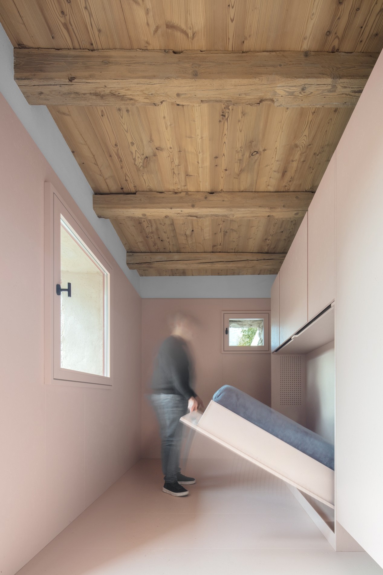 K zázemí patří kuchyňská linka, sprchový kout. A originálním způsobem vestavěná postel, která může snadno zmizet (nebo být zaklopena) do stěny. Místo tak nezabírá, interiér působí poloprázdným dojmem. Foto: Gustav Willeit