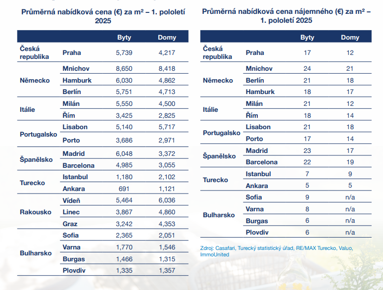 Přestože jsou ceny bytů v Praze srovnatelné či dokonce vyšší než v řadě evropských metropolí, nájmy zůstávají relativně nižší, což je dáno především slabší kupní silou. Průměrná nabídková cena za metr čtvereční nájmu činí v Praze 17 eur, zatímco v Berlíně nebo Miláně dosahuje 21 eur, v Barceloně 22 eur a v Madridu dokonce 23 eur.