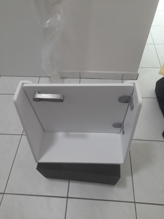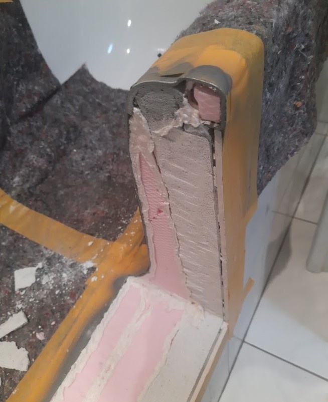 Další činností je vyřezání otvoru do vany (obr. 3). Po začistění otvoru se provede výplň vyniklých dutin nenasákavým polystyrenem (obr. 4) a utěsnění všech vzniklých spár. Poslední etapou je vsazení dvířek a utěsnění spáry. Po ukončení montáže uklidí a odnese firma všechny odpadní materiály.