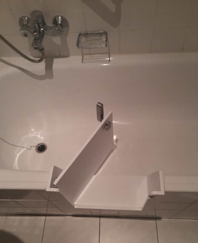 Výsledná podoba zásahu je vidět na obr. 5. Po 24 hodinách je možno využít vanu pro koupel (obr. 6). Podle původního osazení vany vznikne různě vysoký schodek mezi dnem vany a podlahou koupelny. Při zvýšené poloze vany je možno používat odnímatelný plastový schodek. Výsledným řešením je snadný přístup do vany pro osoby s omezenou pohyblivostí. Pro bezpečnější pohyb během koupele je ke stěně připevněno madlo.