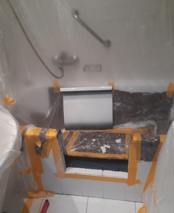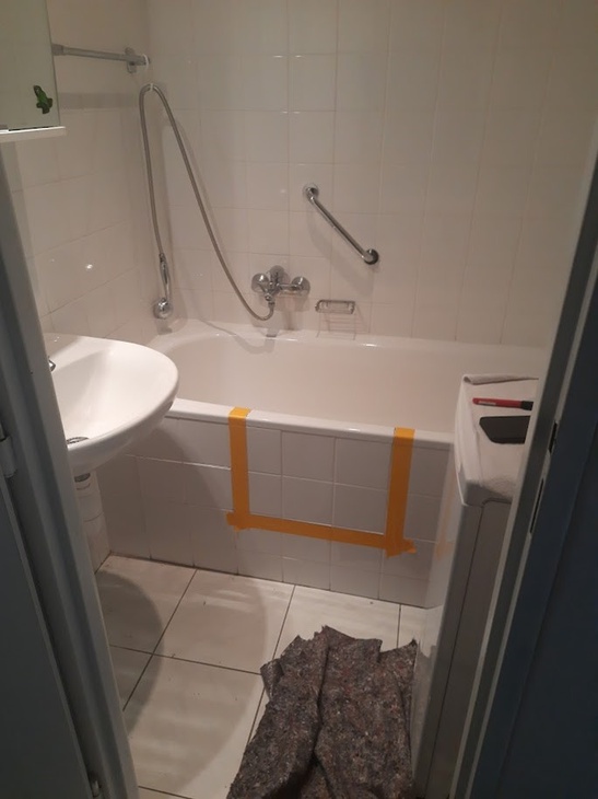 Nejmenší a nejkratší zásah do provozu bytu je využitím netradičního řešení osazením vstupních dvířek do stávající vany (obr. 1). Firma si provede zaměření stávajícího stavu a na jeho základě si vyrobí dvířka, která následně osadí do tělesa vany. Vlastní montáž spočívá v zakrytí stěn a zařízení koupelny. Během práce se nemusí vymístit žádné ze stávajících zařízení (např. pračka). Následně se provede vymezení budoucího otvoru do stěny vany (obr. 2).