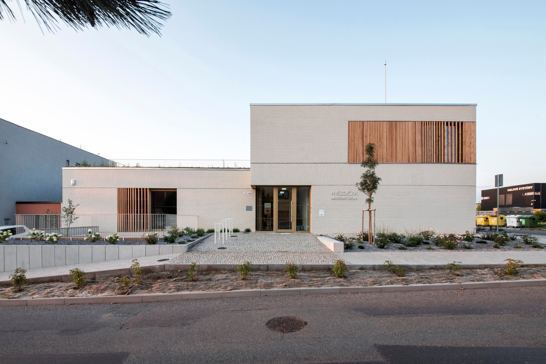 Hlavní vstup mateřské školy je ze severní strany a je zvýrazněný odskokem v ploše fasády. Ten vznikl tím, že jsme potřebovali navázat na uliční čáru sousedních domů, ale zároveň bylo nutné využít celou zastavitelnou část pozemku. Díky tomu je vstup patrný na první pohled a v předprostoru školky ještě vznikla dostatečná plocha pro loučení s rodiči i dokončení odpoledních her s kamarády. Část oplocené předzahrádky navíc slouží jako pobytová terasa pro jednu ze tříd.
