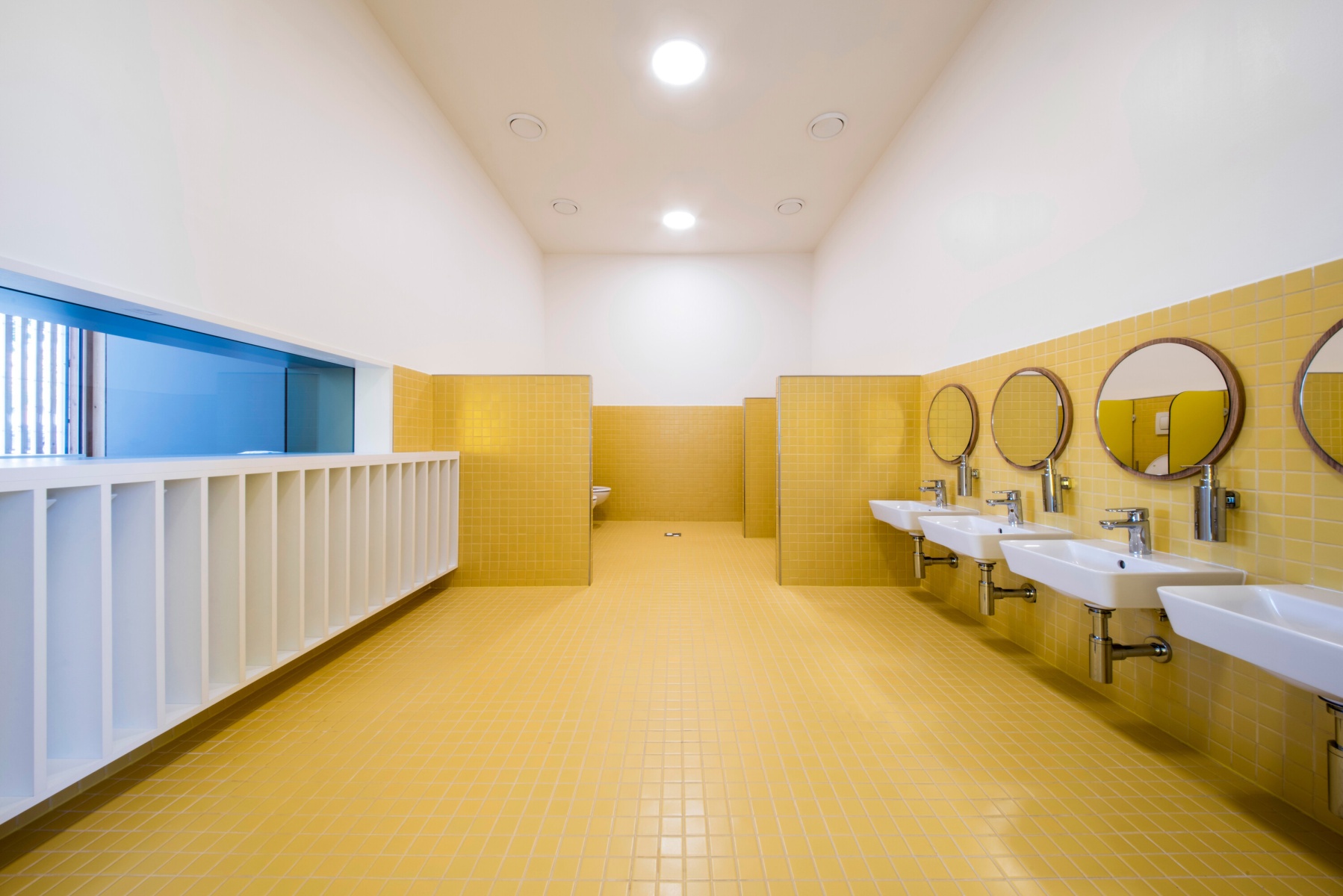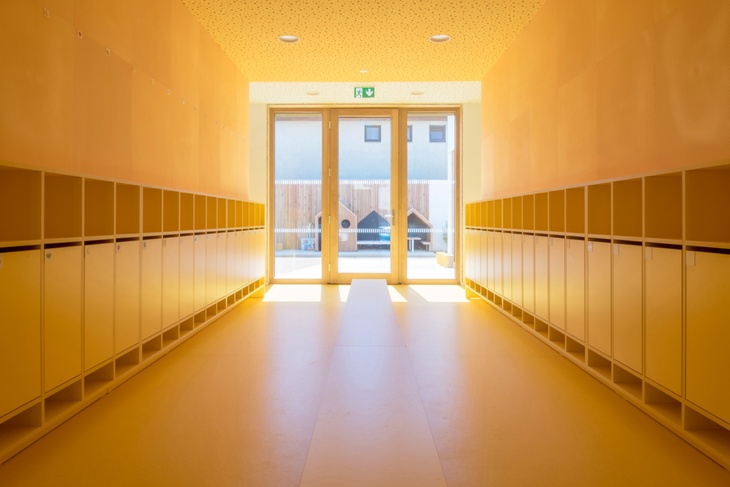 Proskleným vstupem z ulice vejdete do výrazně žluté centrální šatny, která slouží jako hlavní komunikace pro celou školku. Projdete přes ni do obou tříd i do zahrady, ze šatny jsou přístupné i výdejny jídla se zázemím, sociální zařízení pro personál a schodiště vedoucí do patra.