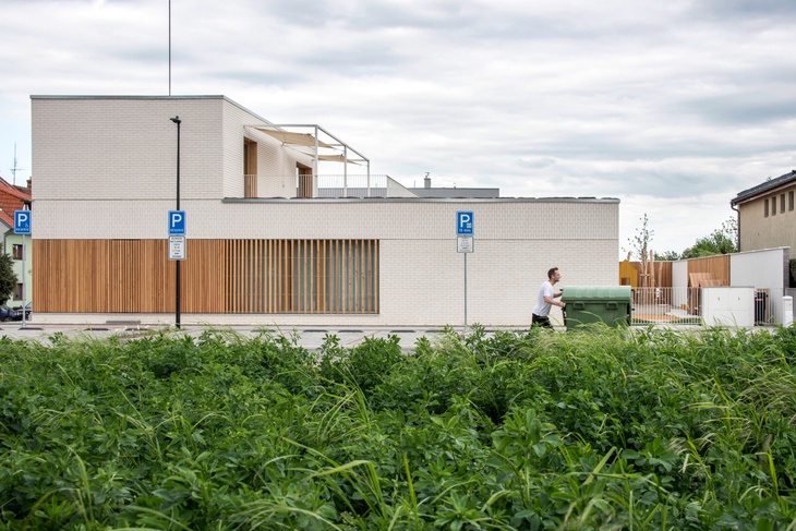 Ve Šlapanicích vyrostla nová mateřská škola mezi rodinnými domy. Na malém nárožním pozemku vznikla kompaktní a hravá dvoutřídka se skrytou zahradou, venkovní učebnou na střeše a pobytovými terasami, které chytře rozšiřují vnitřní prostory obou tříd.