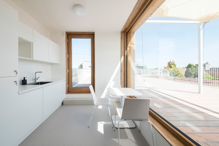 Nám se ale nechtělo dát jednu ze tříd do patra a ochudit ji o kontakt se zahradou. Raději jsme přišli s efektivním návrhem, ve kterém se vejdou obě třídy do přízemí a centrální šatna slouží jako hlavní komunikace pro celý dům. Kompaktní prostor obou tříd rozšiřují pobytové terasy, takže děti můžou za hezkého počasí využívat i předzahrádku školky a kus zahrady bez přezouvání. Obě třídy mají velkorysá okna do ulice i do malé zahrady a na střeše vznikla venkovní učebna s vyvýšenými záhony, na které si připadáte jako na palubě lodi. Je přístupná přes denní místnost v patře a také po bílém točitém schodišti rovnou ze zahrady.