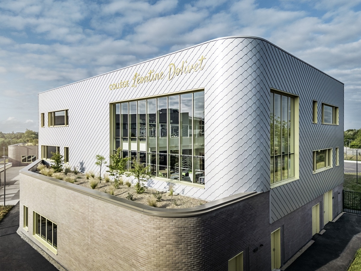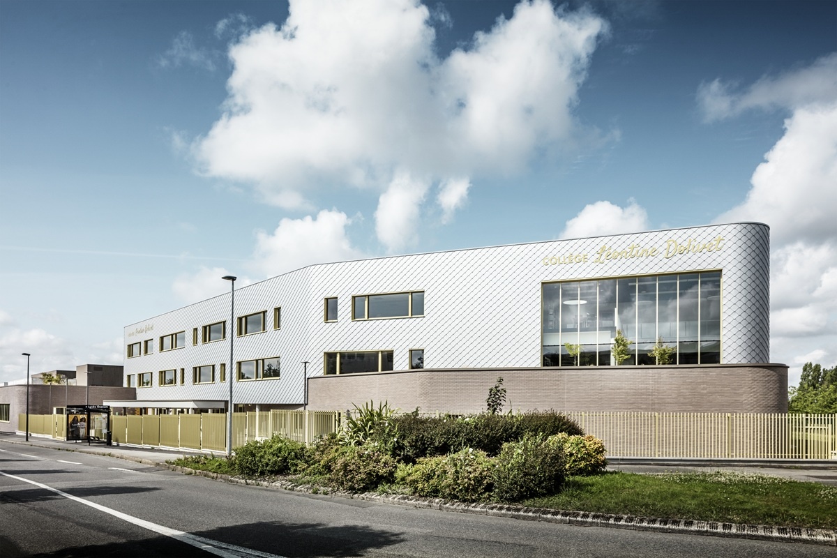Horní dvě patra střední školy jsou díky hliníkové fasádě vizuálně odlehčená a kontrastují s robustním cihlovým přízemím. Zaoblené rohy, které lemují celou stavbu, ještě více umocňují pocit lehkosti a pohybu. Aby byl tento detail technicky i esteticky dokonalý, musely být fasádní šablony individuálně zaobleny – úkol, který precizně zvládla bretaňská společnost Quemard.
