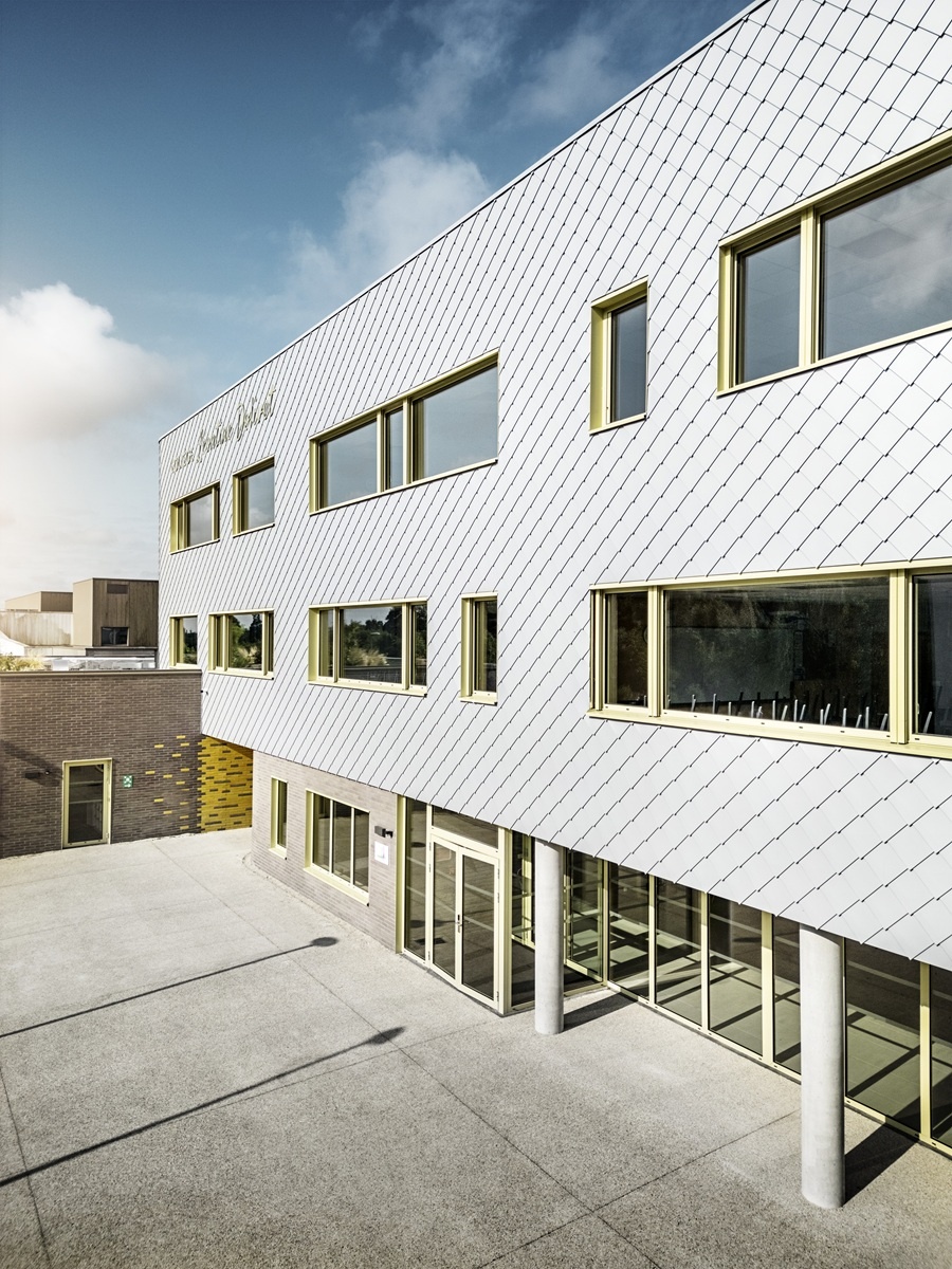 Školní budova s originální fasádou z hliníkových šablon PREFA
