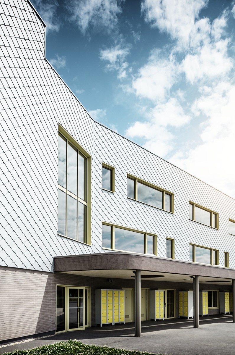 Školní budova s originální fasádou z hliníkových šablon PREFA
