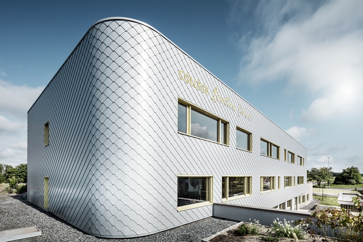 Školní budova s originální fasádou z hliníkových šablon PREFA