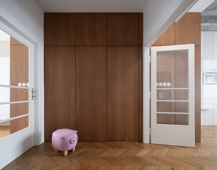 Náš dvoupokojový byt je případ, kdy zde funkcionalismus máme dobově jasně zakotvený a pracujeme s ním při kompletní rekonstrukci. Pro vysvětlenou, proč je „růžové prasátko“ součástí názvu. Je to dárek od přátel, taburet do předsíně, krásná nadsázka a vtipný maskot, barevné ozvláštnění haly.
