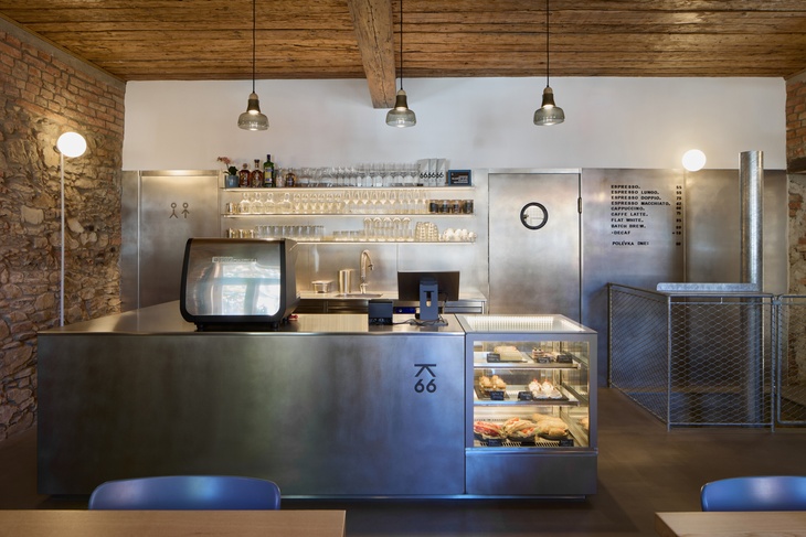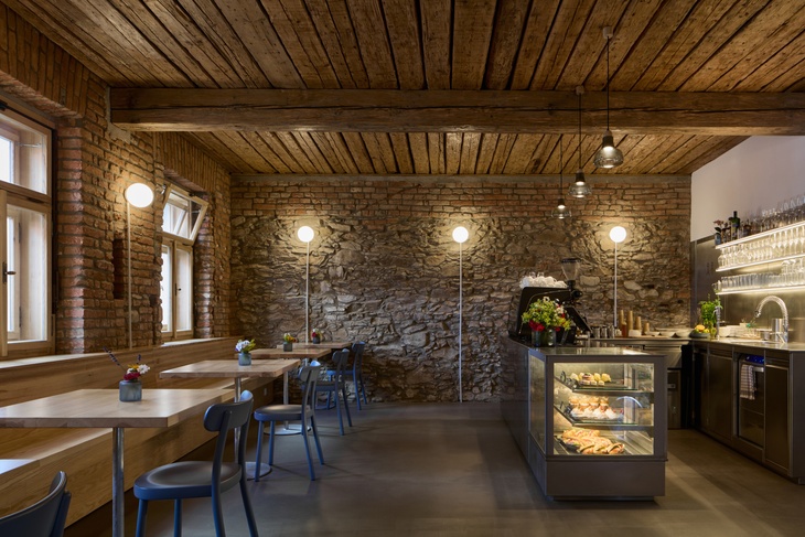Právě historická stavba do náměstí slouží jako kavárna. Obnažené zdivo i povalový strop uvnitř přiznávají jizvy po minulých funkcích i úpravách. Do odhalené vnitřní struktury je vložený přesný nerezový objem kavárenského pultu i dalšího nezbytného zázemí jako jsou toalety. Hosté sedí na dlouhé jasanové lavici a modrých židlích. Vzniká tak pestrá povrchová koláž složená z autentických a přirozených materiálů – ať už původních nebo zcela nových. Kavárenské bistro se rozšiřuje průjezdem až na dvůr, kde hostům slouží dlouhá betonová lavice.