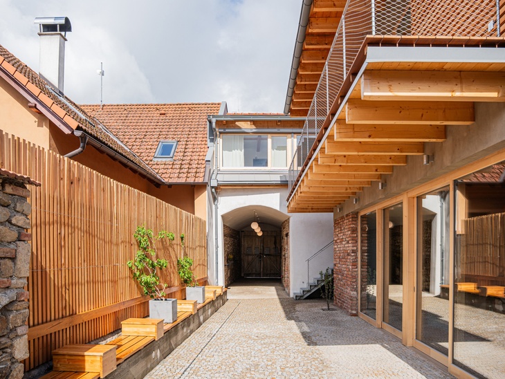 Zcela nová je přístavba ve dvoře vložená do stopy původních hospodářských stájí. Její architektura nezastírá soudobost, ale reaguje na principy původních domů. Parter je vyzděný ze starých cihel z bouračky, vysazená pavlač je nesena na dřevěných trámech a doplněna o křehké ocelové schodiště a zábradlí. Za prosklenou stěnou přístavby je v přízemí studio sloužící pro jógu, přednášky nebo semináře.