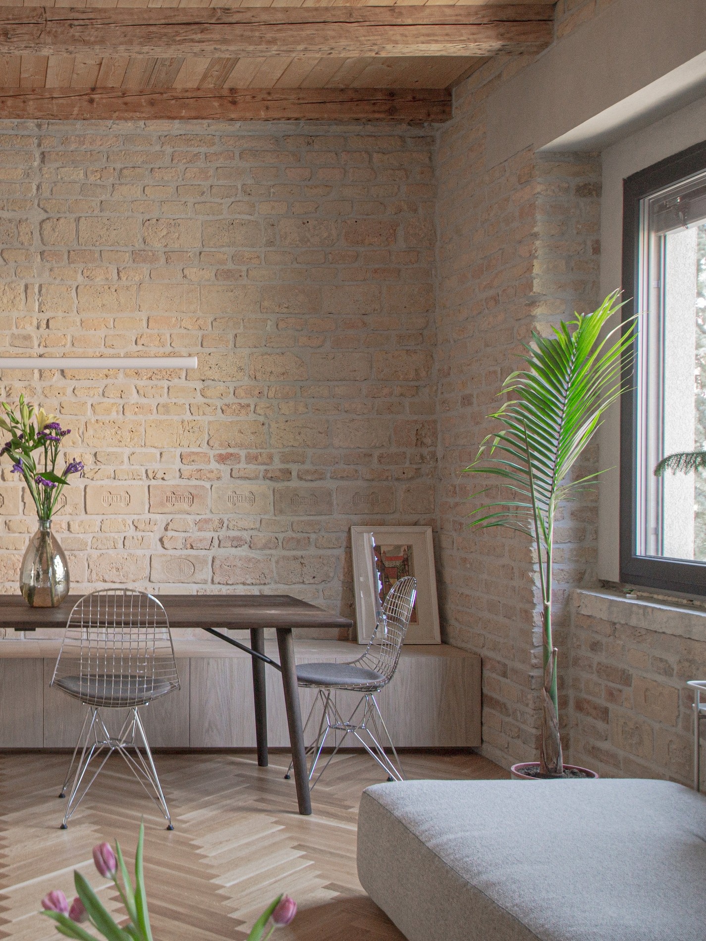 Dům z padesátých let dostal moderní interiér. Panuje zde krása původních cihel a letitého dřeva. Foto: Ing. arch. Marián Gombarček a M&T