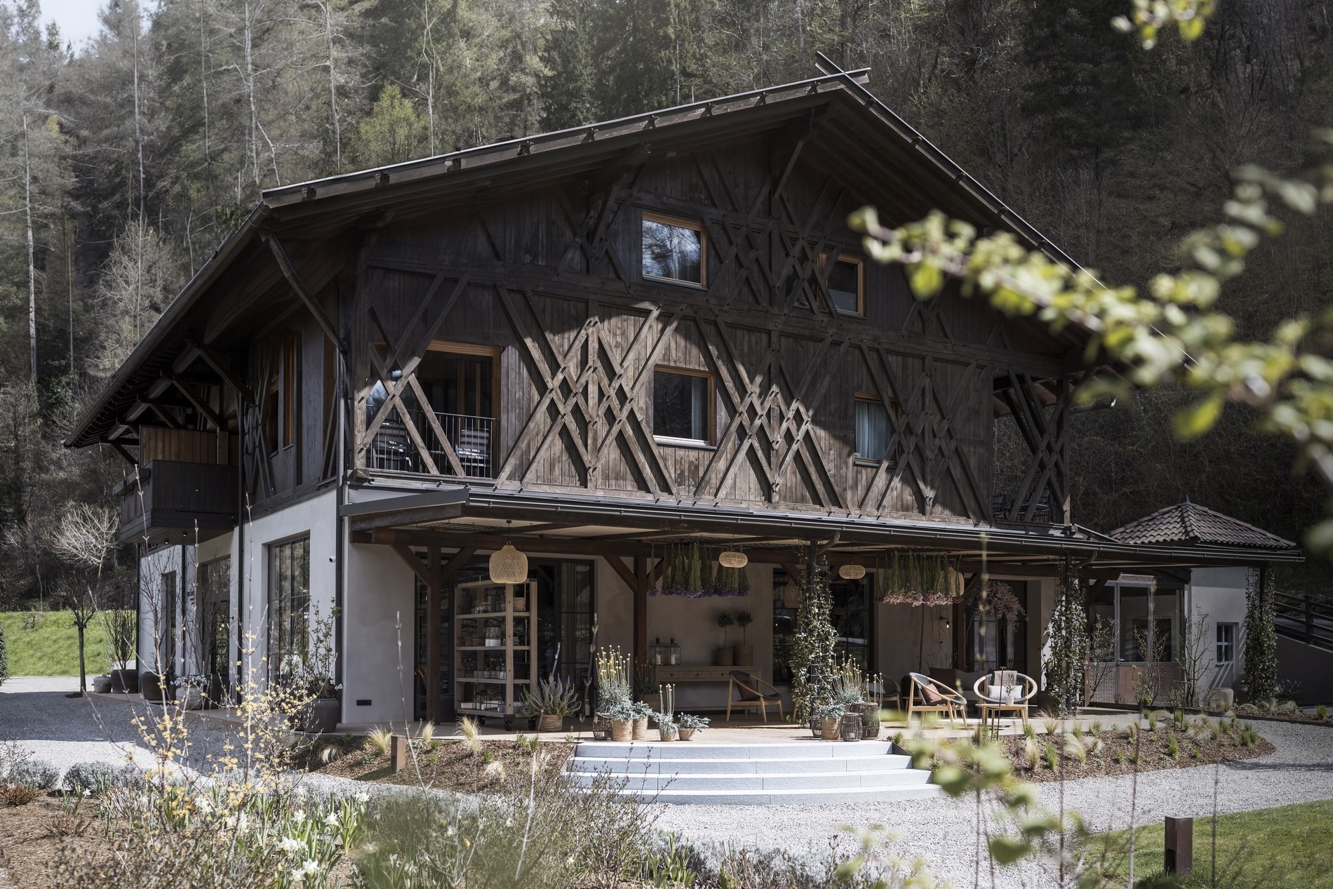 Alpská stodola, která je hotelem, dílnou, prodejnou i degustačním salónkem. Foto: Alex Filz