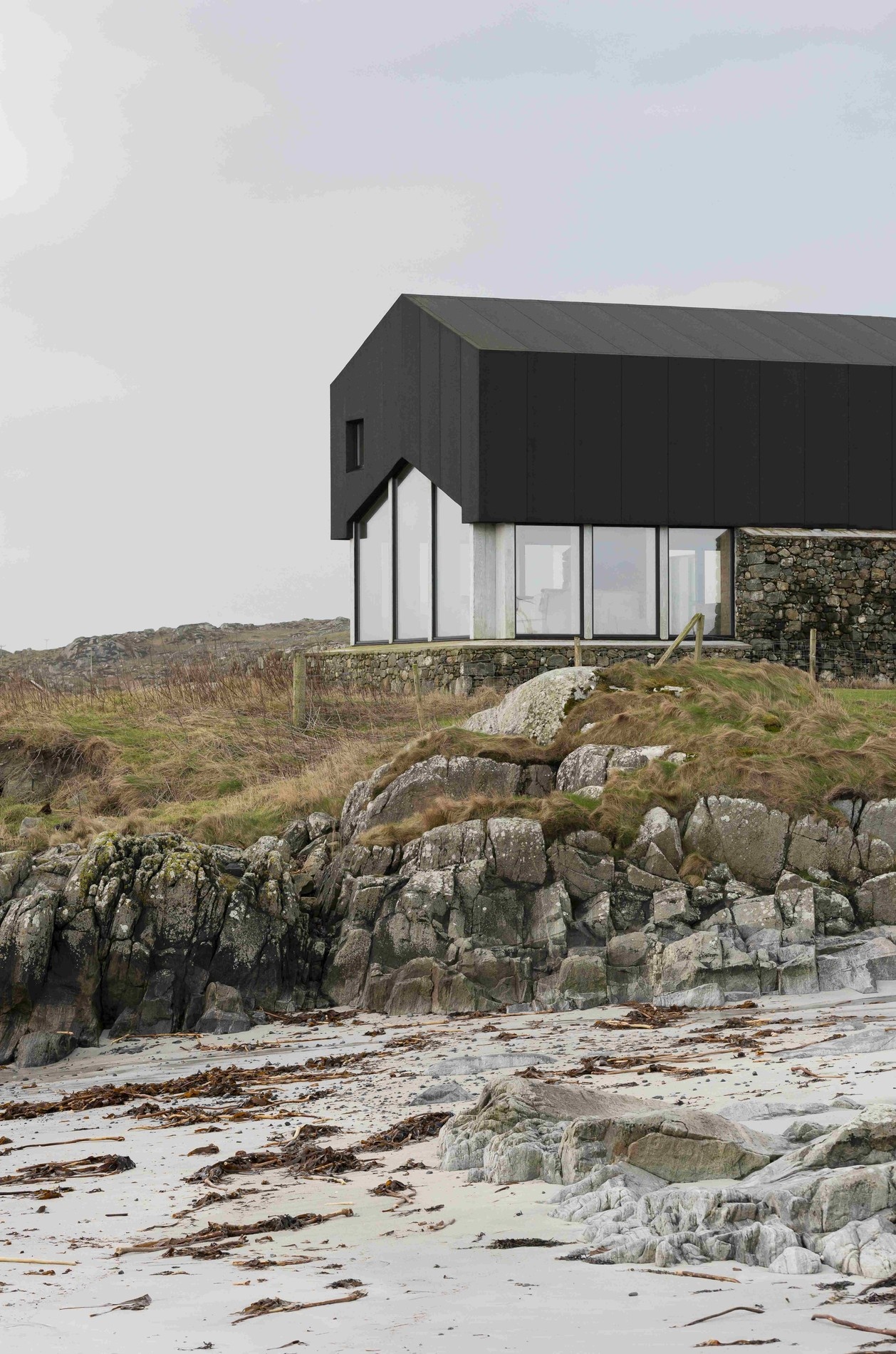 Dům je obložen materiály odkazujícími na místní stavební tradice, přičemž obě křídla mají odlišnou úpravu, která připomíná nahodilost a různorodost staveb na okolních farmách. Foto: Gilbert McCarragher