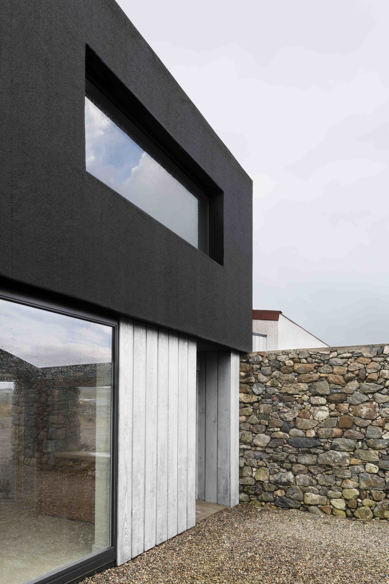 Z dvora vede dveřní otvor do chodby, která prochází celým domem a vrcholí v obývacím pokoji, kde se negativní tvar kamenného štítu opakuje ve třech pevných skleněných panelech. Foto: Gilbert McCarragher