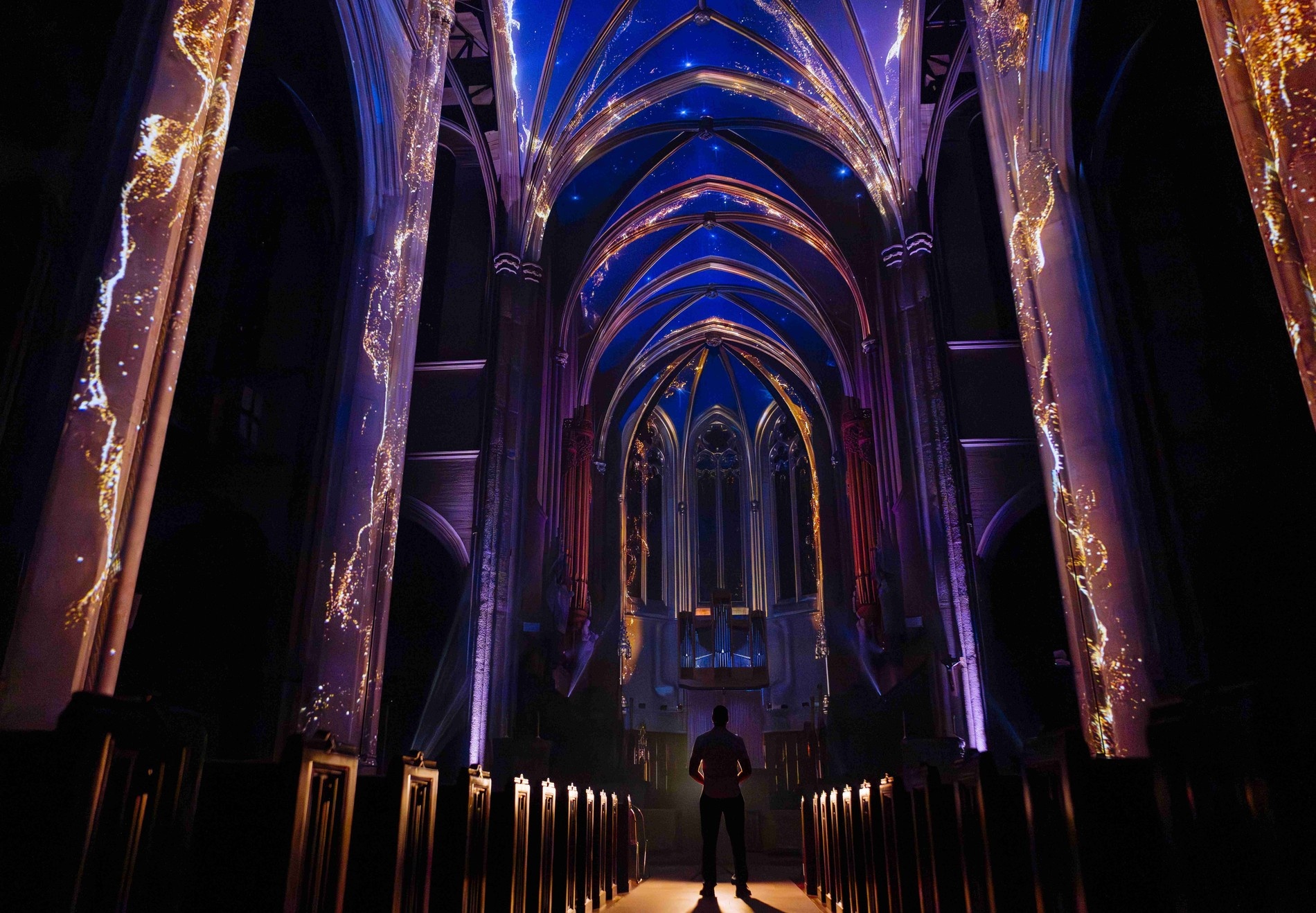 Světelné prvky a chytře řešený videomapping rozvíjí přirozenou poetiku místa a posouvá ji na vyšší úroveň. Představení tu sledujete v tichém úžasu, se zakloněnou hlavou, ohromení. I proto, že show není statická. Foto: AURA Grace Cathedral, Moment Factory.