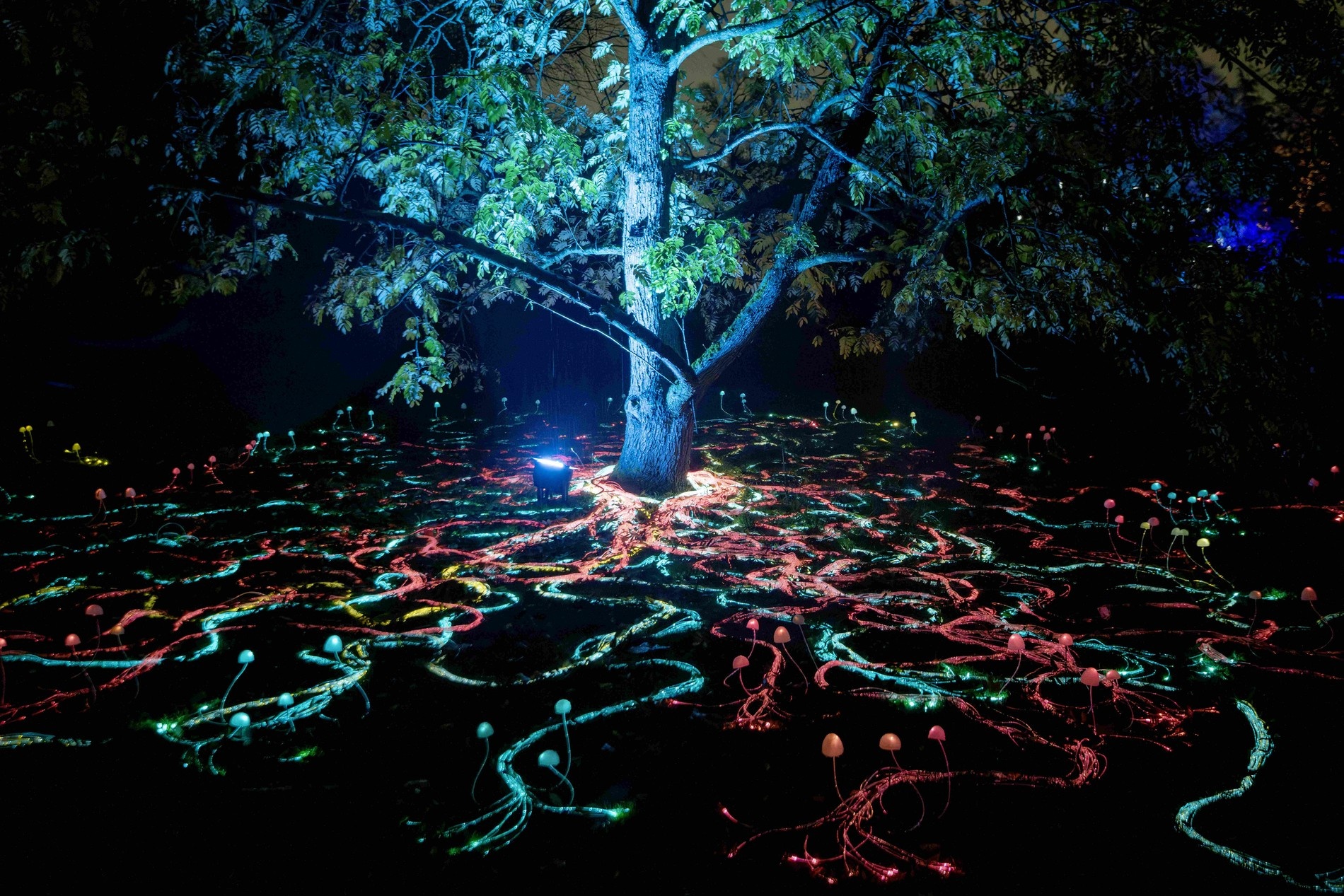 Novinkou bude také Mycelium Network, která osvětlí zem jemnými stojany z optických vláken, představujícími propojenost houbových vláken, jež hrají zásadní roli v ekosystémech po celé planetě. Foto: Jeff Eden
