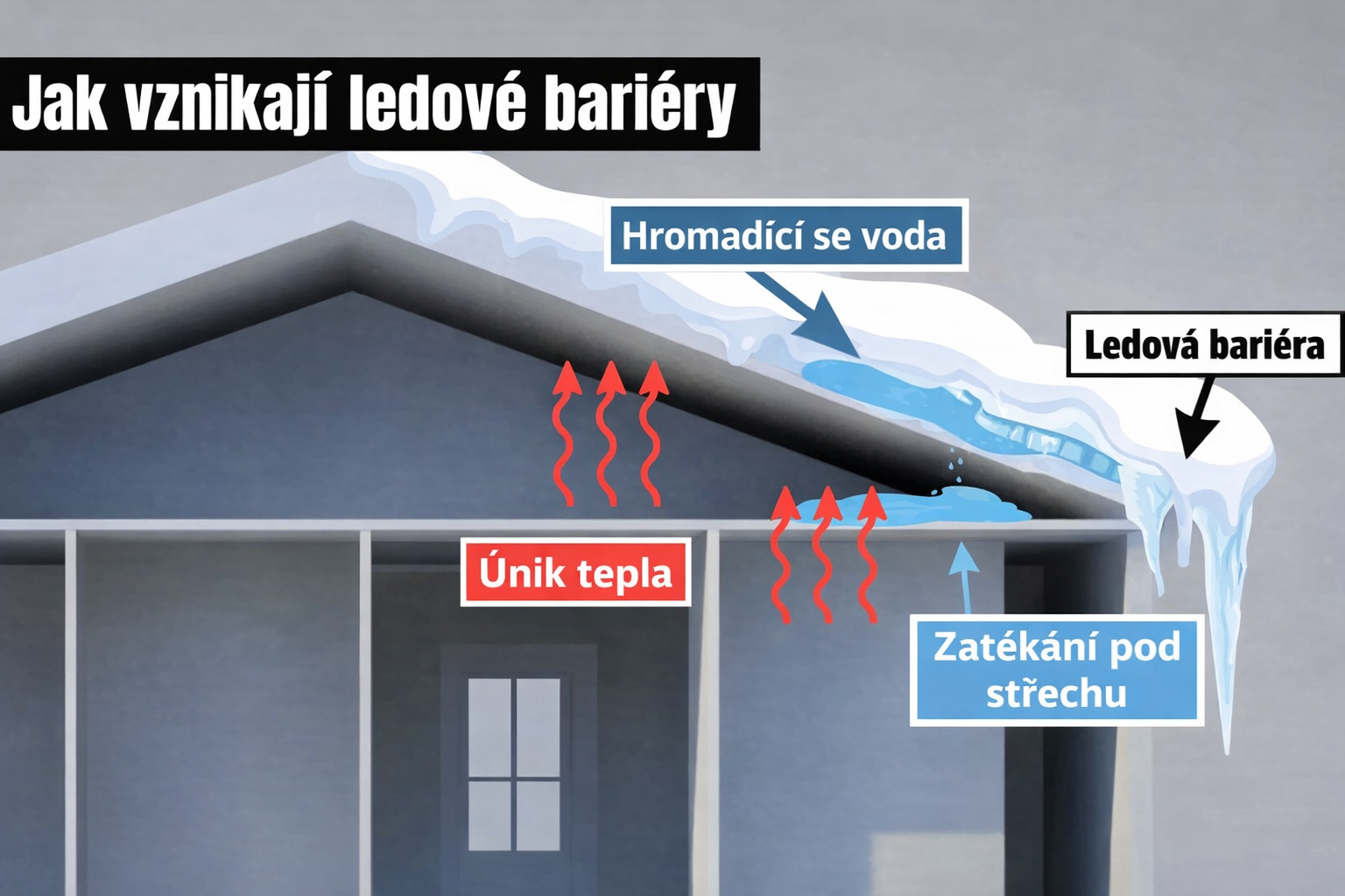 Hromadění sněhu neprověří pouze nosnost střechy, ale také její schopnost odvádět vodu. Jakmile sníh na střeše leží delší dobu, začne fungovat jako izolace a unikající teplo z domu způsobí, že sníh v kontaktu se střechou zespodu povolí. Vzniklá voda stéká k okrajům střechy, kde při mínusových teplotách znovu zmrzne. „Prvním viditelným signálem, že na střeše dochází k opakovanému tání a mrznutí, bývají rampouchy,” říká Jakub Hemza. Pokud se led na okrajích střechy hromadí a není pravidelně odstraňován, dochází k vzniku tzv. ledových bariér, které brání přirozenému odtoku vody a fungují v podstatě jako ledové přehrady. Tající sníh se zde hromadí a tlačí zpět pod krytinu, kde začne pronikat do konstrukce střechy.