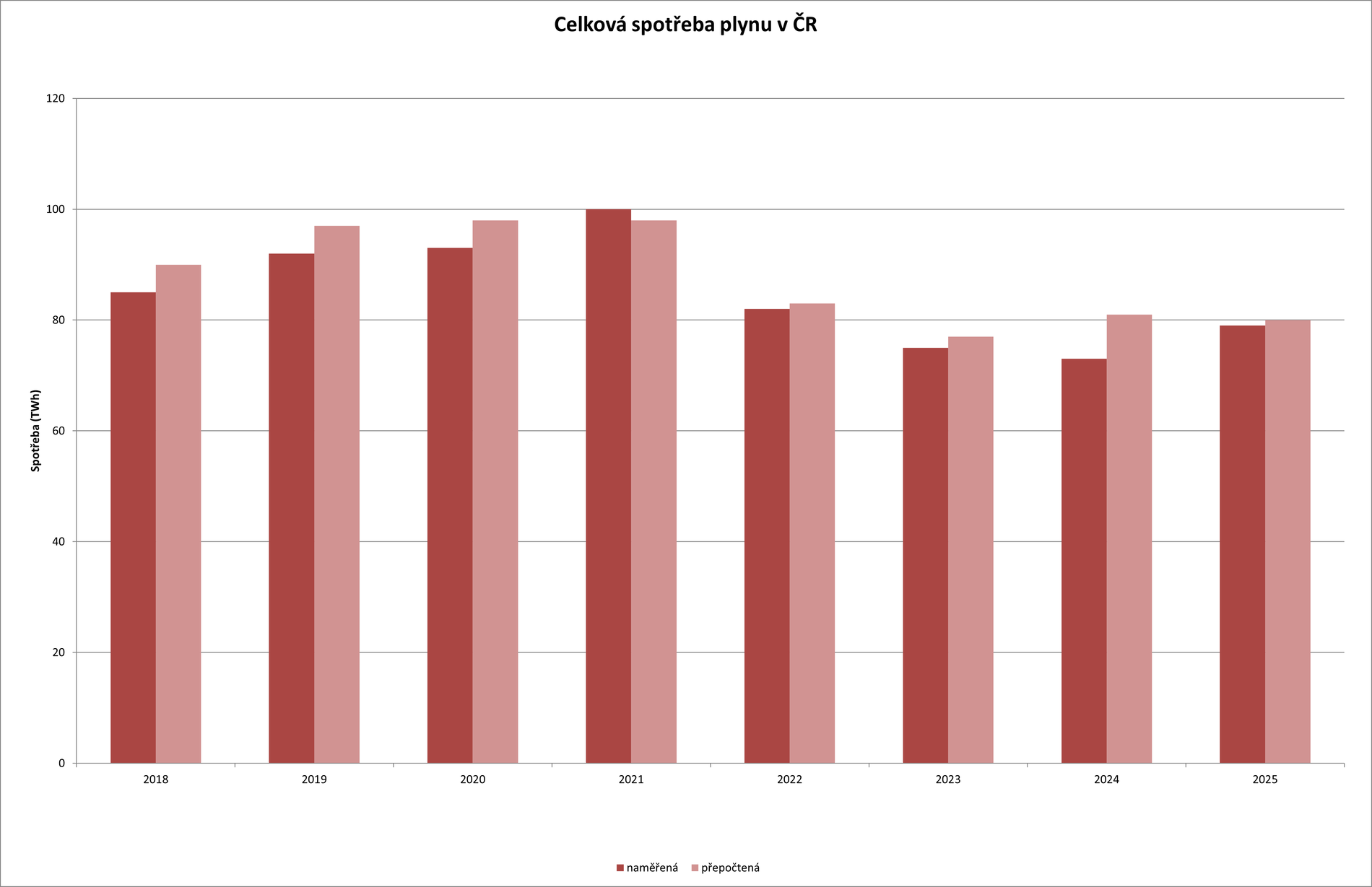 Spotřeba zemního plynu se v naměřených hodnotách v České republice v roce 2025 oproti předchozímu roku zvýšila o 6,9 % na 79 TWh. V teplotně přepočtených hodnotách ale podle poradenské společnosti EGU poklesla o přibližně 1,2 %. Tento výsledek je daný velmi výrazným teplotním rozdílem mezi posledními dvěma topnými sezonami.