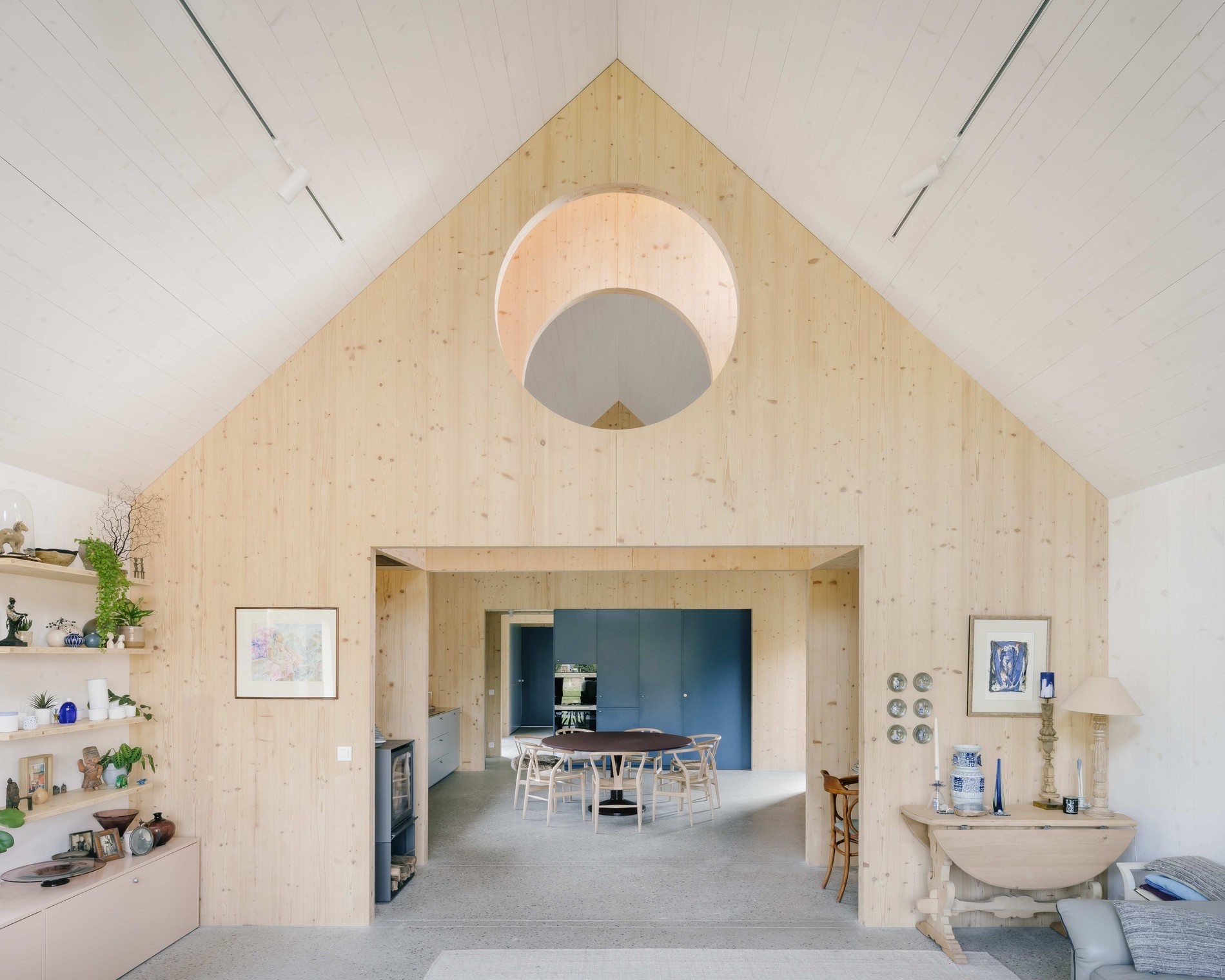 Viditelný rytmus odhalených dřevěných rámů z CLT definuje interiérovou architekturu a vnáší do zážitku z pohybu v domě strukturu, teplo a materiálovou bohatost. Ačkoli je dům skromný, je praktický. Výrazná linie střechy odhaluje tři „komíny“. Tyto vertikální prvky nejenže obsahují podpůrné funkce, ale také vnášejí světlo do hloubky půdorysu – z různých orientací – a osvětlují tak srdce domu.