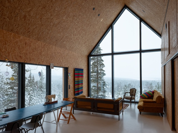 Průměrná teplota v únoru činí v okolí jezera Inari osmnáct stupňů pod nulou. Průměr ovšem nehovoří o extrémech, které tu ne až tak mimořádně dosahují i pětatřicet stupňů Celsia v mínusu. Zkrátka nic, co by zahřálo u srdce. Co už naopak potěšit a zahřát může je, když se na ty krásy zimního Laponska můžete dívat z interiéru vyhřátého srubu. Žádný takový ale severně od jezera, na kótě s příhodným rozhledem, nestál. A na architektech ze studia Pirinen Salo Oy bylo, na popud klientů, to změnit.