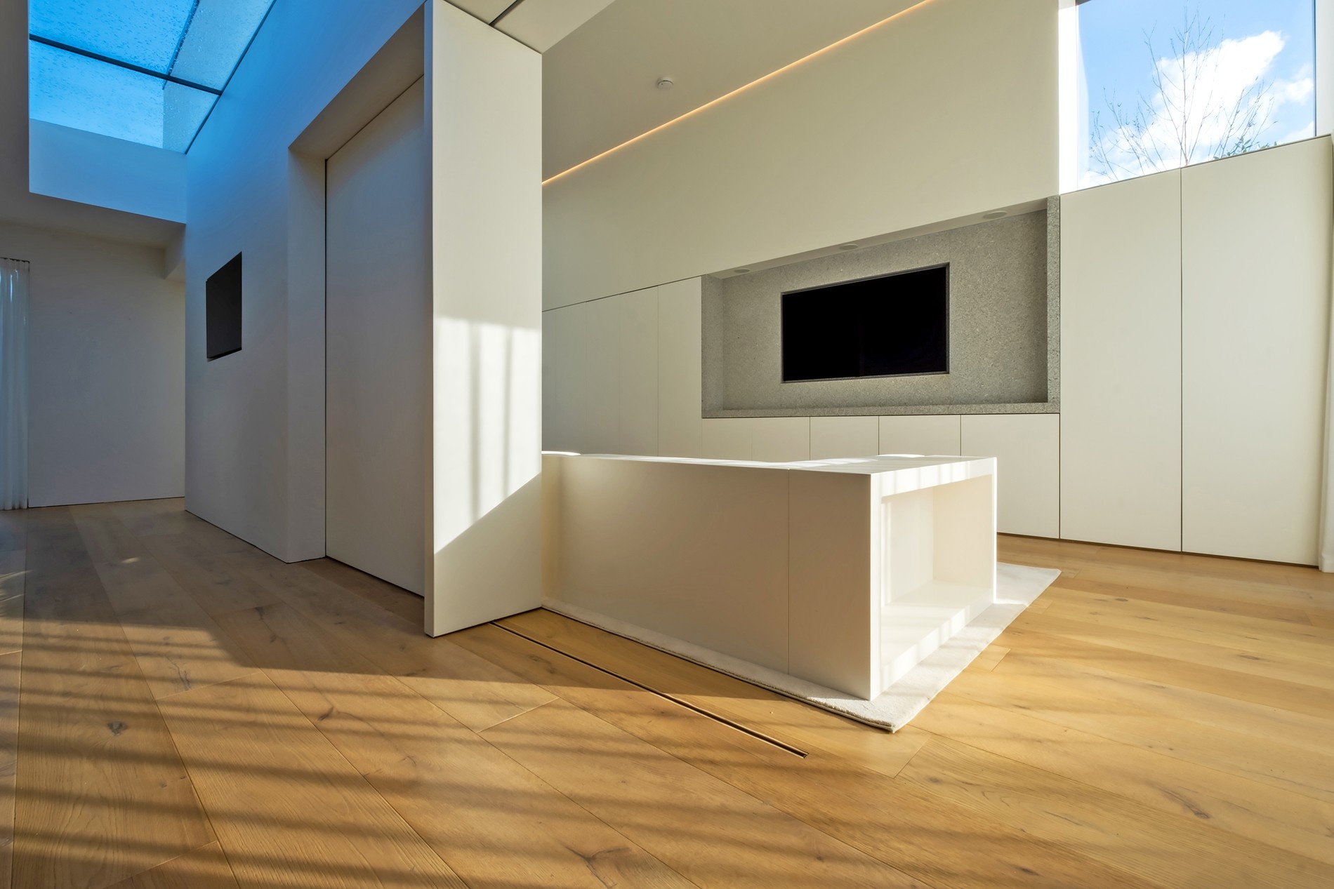 Vestavěný nábytek se tu nedotýká stropu. Je vsazen do stěn a koresponduje s prosvětlujícími střešními okny. Foto: Shane Lynham